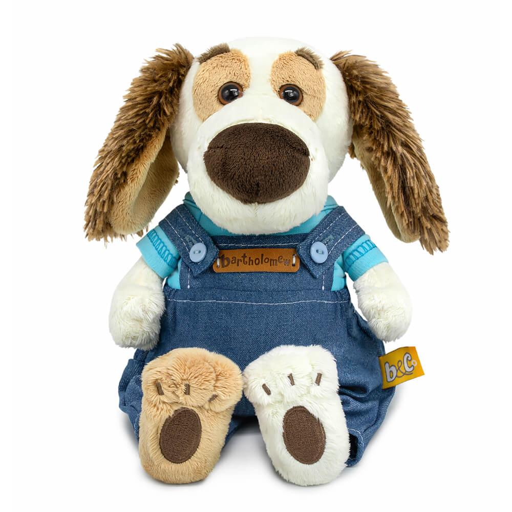 Bartholomew is wearing a concise denim suit in blue with a gray tint. The wide trousers and jacket with blue buttons are finished with contrasting stitching. There is a pocket on the front of the jacket and a label with his name printed on it.