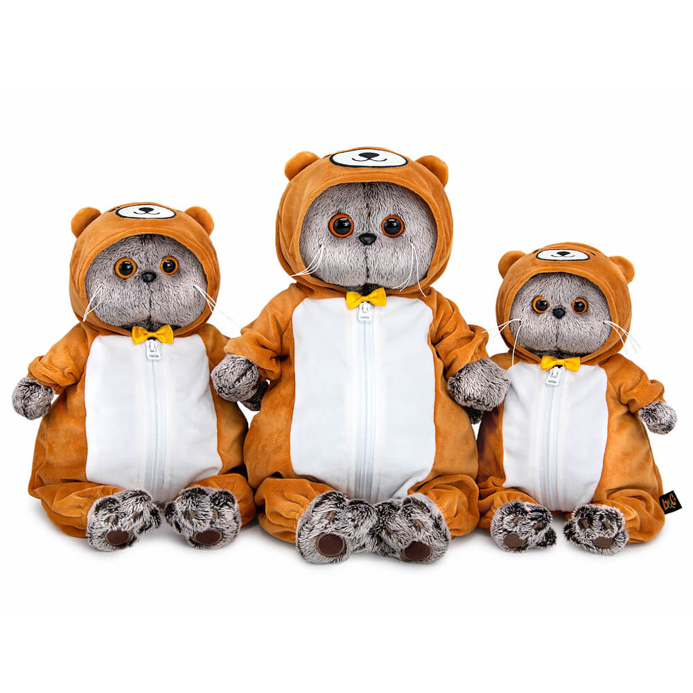 Basik the cat in a cute kigurumi "Teddy Bear". The kigurumi is made of delicate caramel-colored soft with a milky soft insert. The hood has an embroidery applique in the shape of a bear's face. The bottom of the sleeves and pants have elastic bands, and the front of the kigurumi is fastened with a zip. Basik has his favorite bow tie around his neck.