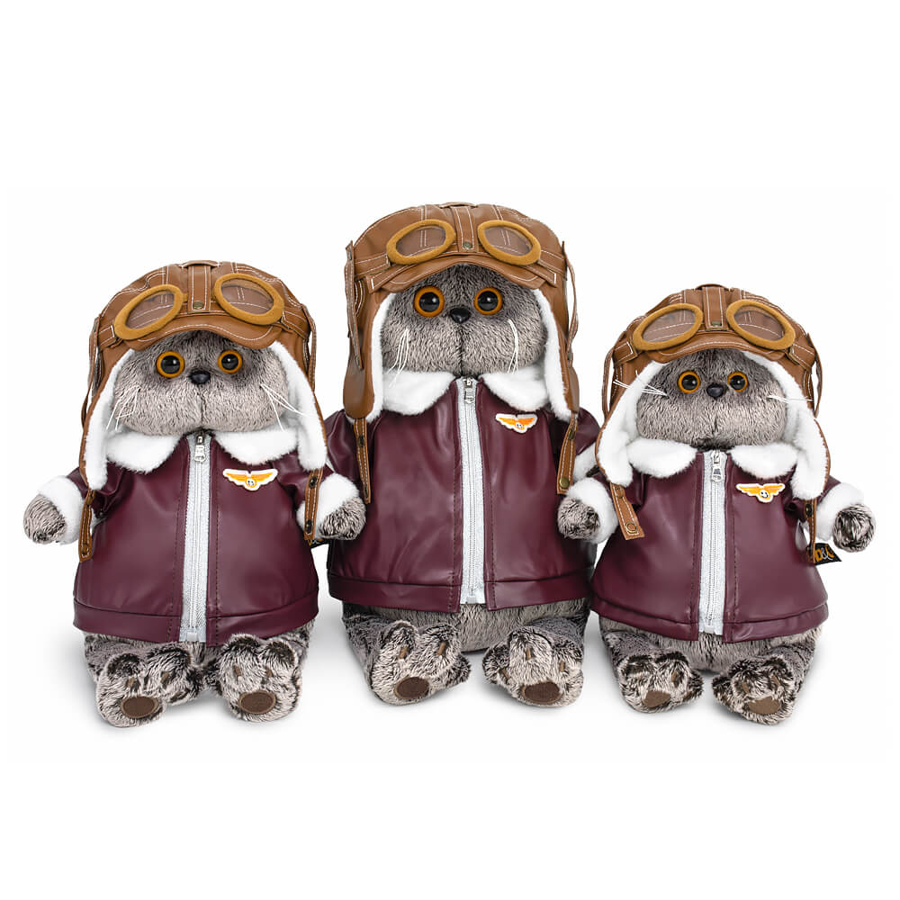 Basik the cat in a super stylish pilot suit. The cat is wearing a pilot jacket made of burgundy-colored faux leather. The jacket is sewn with a wide trim at the bottom, featuring a turned-down collar and cuffs made of short, snow-white fur, with a front closure on a silver zipper. The front of the jacket is decorated with a patch in the shape of wings. Basik is also wearing a cool pilot helmet, made of caramel-colored faux leather with a white fur lining. The helmet is detailed with contrasting stitching and straps with brass rivets. Special pilot goggles with a trim made of sand-colored faux suede are attached to the helmet.