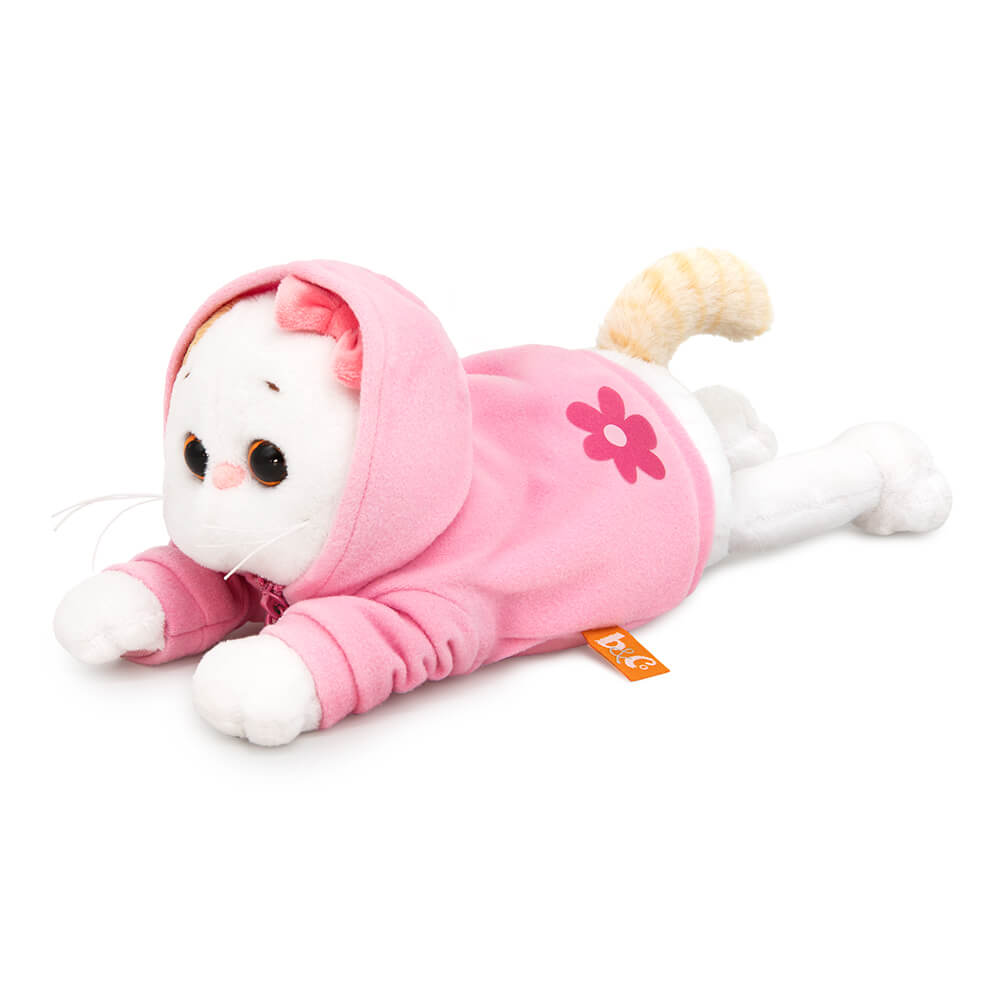 Cat Li-Li in a trendy pink caramel fleece hoodie. The hoodie is sewn with a hood, with a pink zipper and a flower print on the side on the back. On Li-Li's ear is her favorite pink bow.