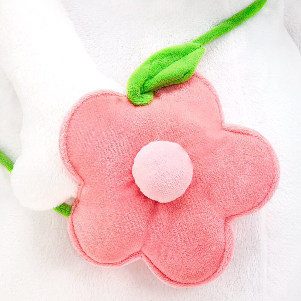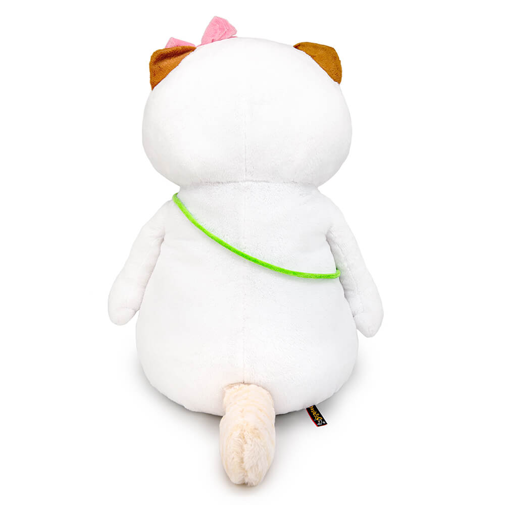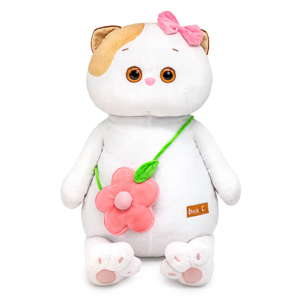 Cat Li-Li with a cool soft handbag on a green strap over the shoulder. The bag is made of soft in the form of a flower with a voluminous middle and a green leaf. On Li-Li's head is her favorite pink bow.