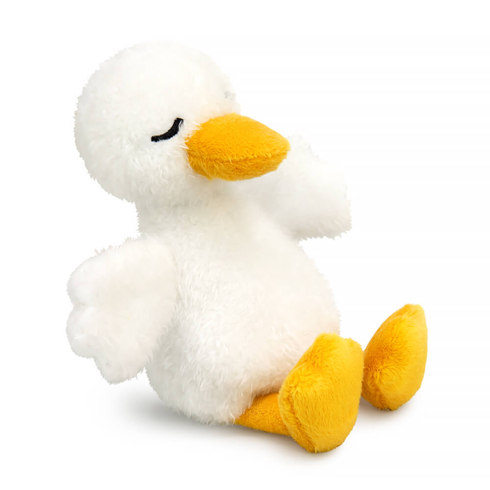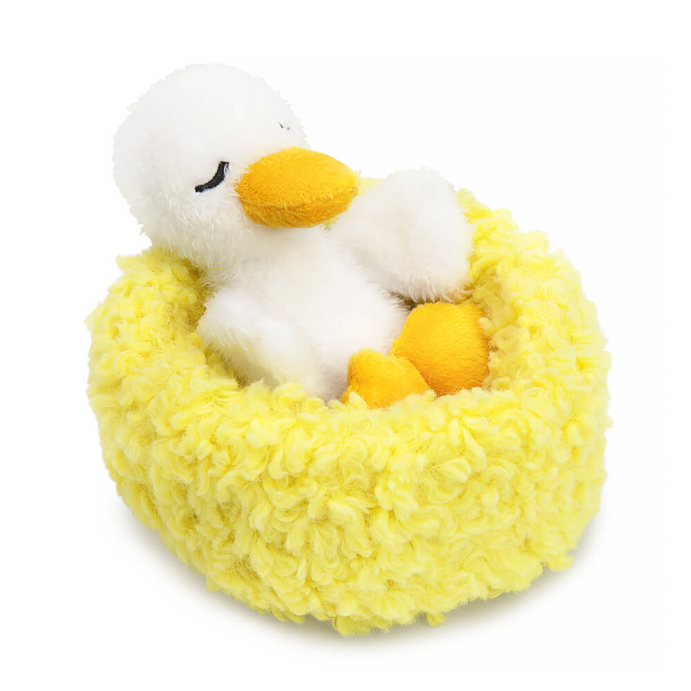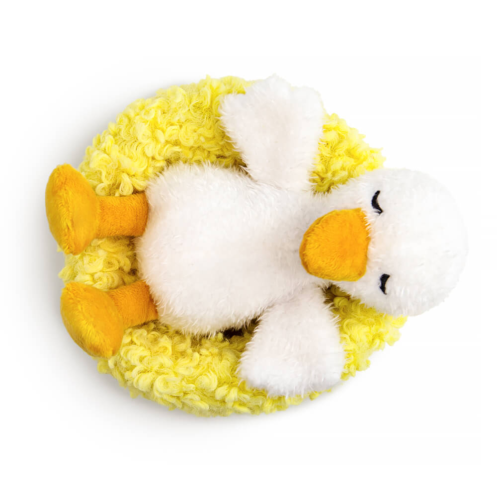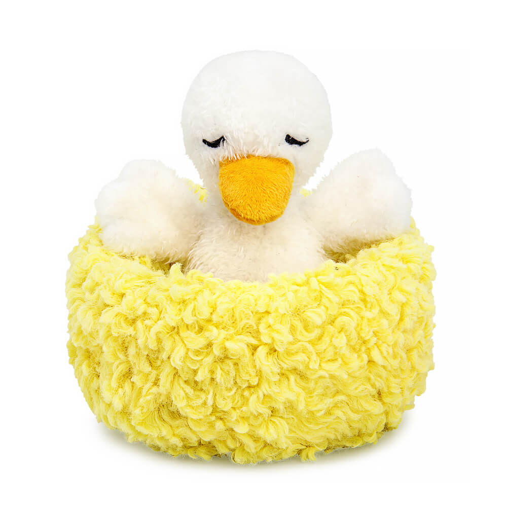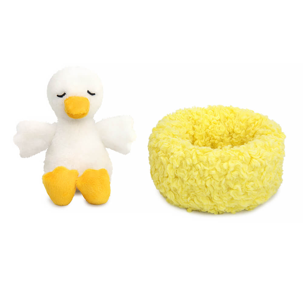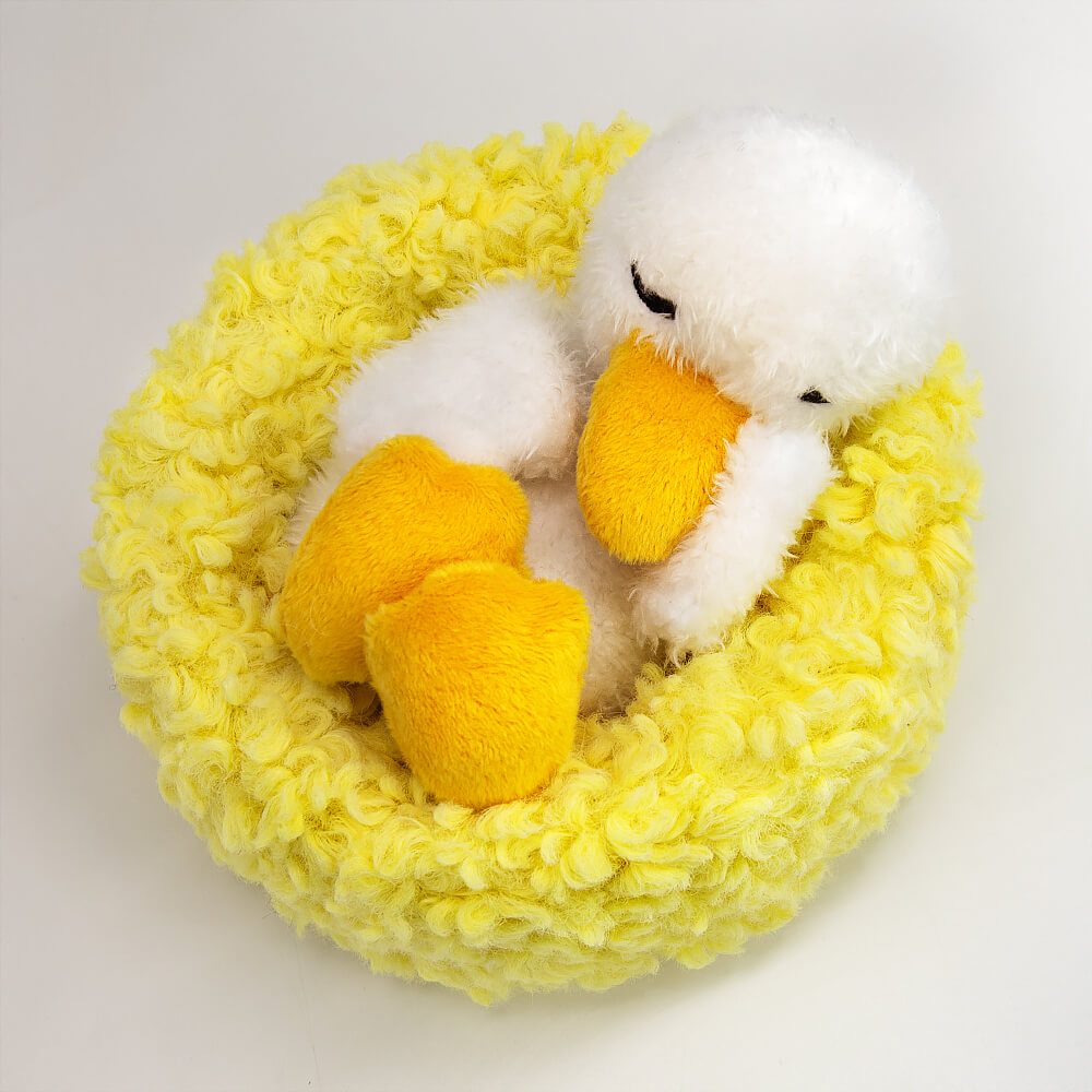Little Goose in a yellow nest. The Goose is made of short-haired white fur, with a soft beak made of ocher soft fur and a long-haired tail. The nest is made of curly yellow fur.