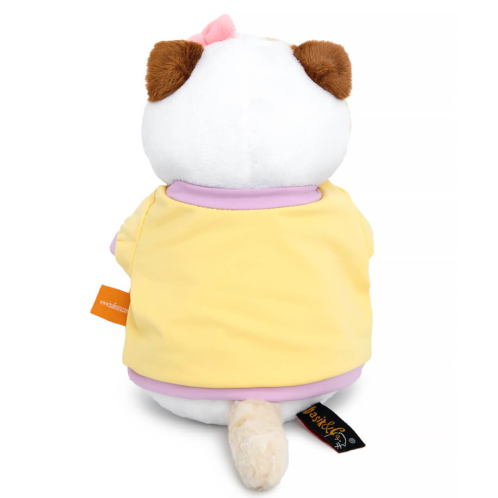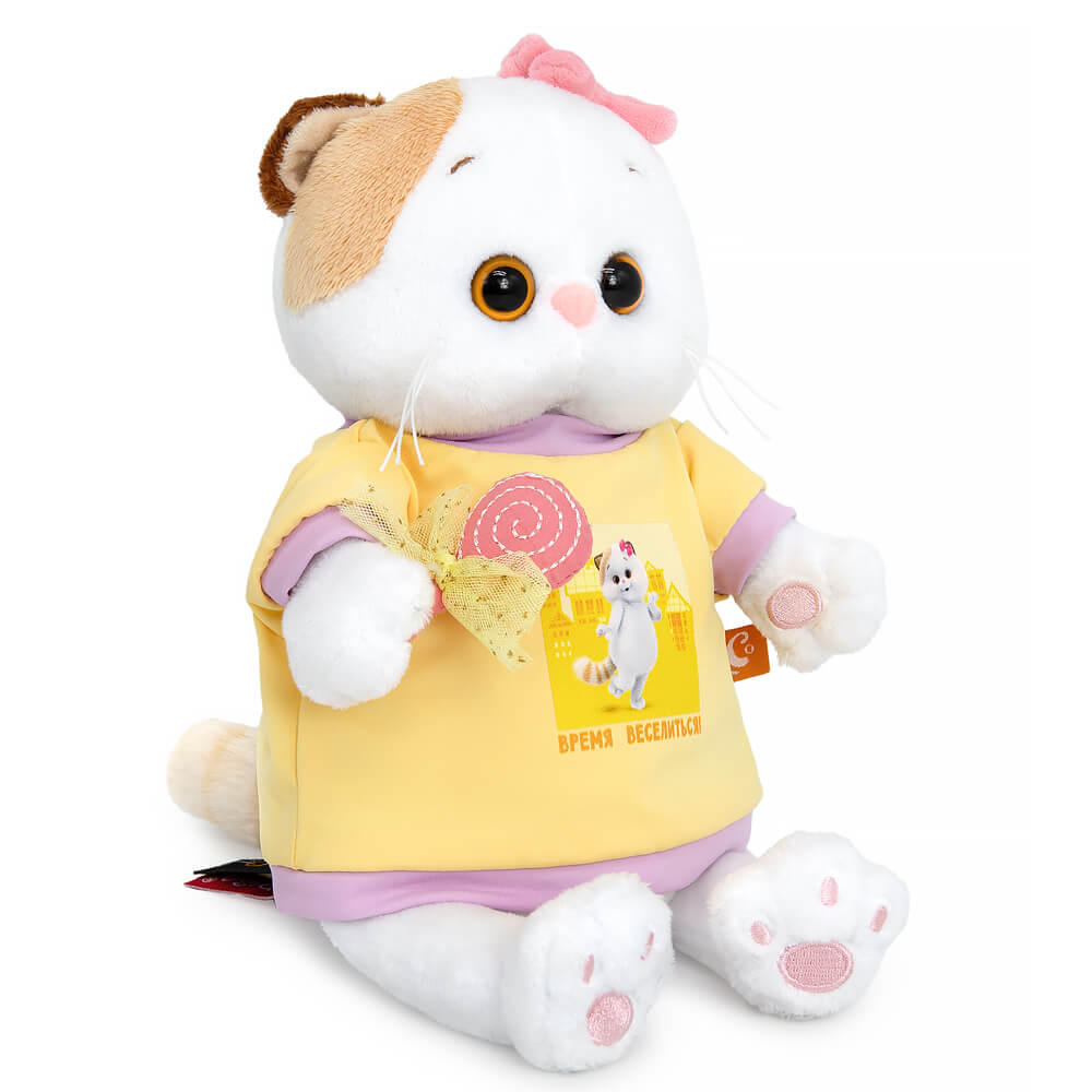 Li-Li in a sweatshirt with a print of "Time to have fun", "Animated Series" Li-Li in a lemonade-colored knitted sweatshirt with lavender trim. On the front of the sweatshirt is a print frame from the animated series with the inscription "Time to have fun!". In her paw, Li-Li holds a funny accessory in the form of a pink lollipop tied with a lemon sequined mesh bow. Li-Li has her favorite pink bow on her ear. The kitty is presented in a branded box with a design in the style of the animated series "Basik the Cat".