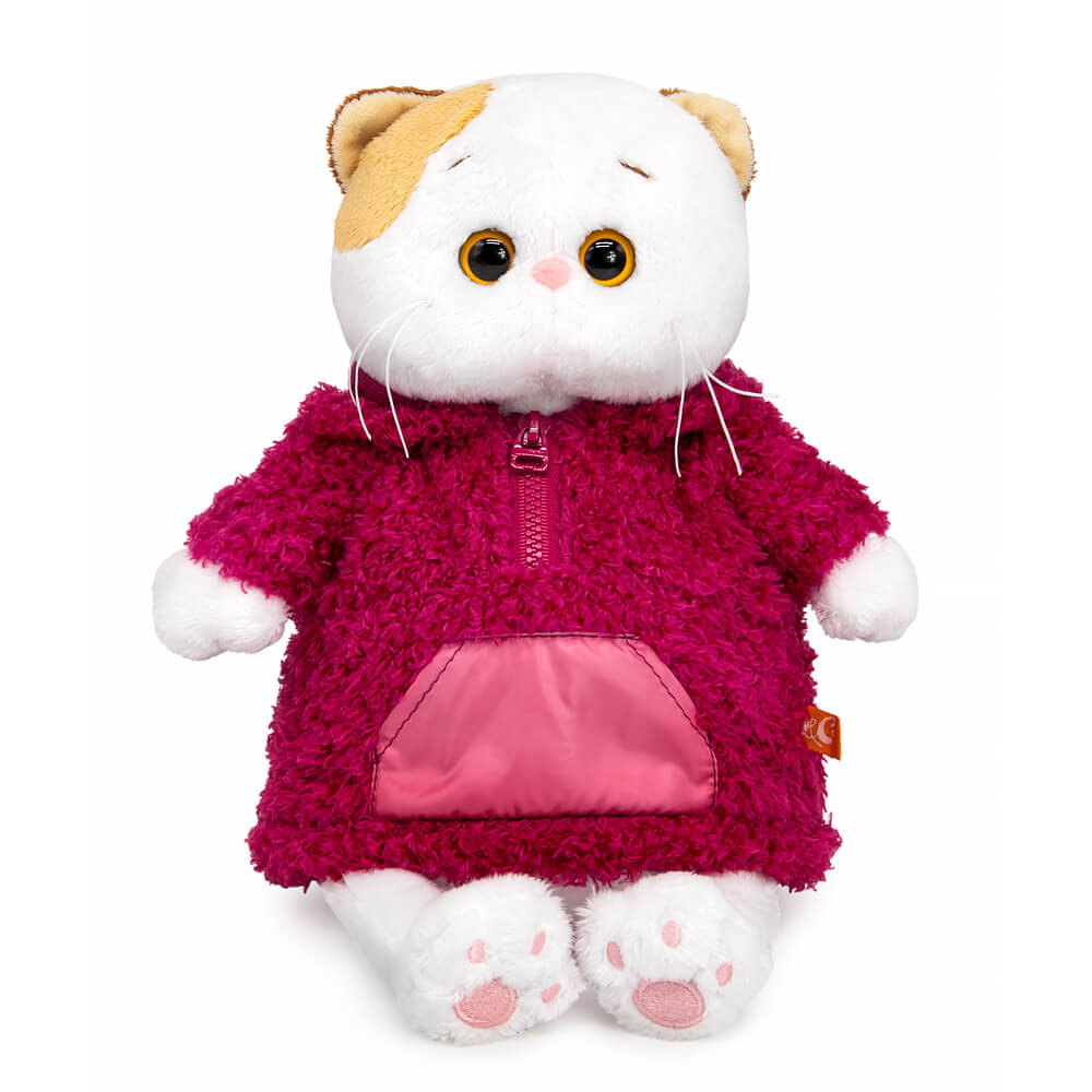 Li-Li kitty in a warm anorak made of short and very soft fur the color of cherry marmalade. The anorak is sewn with a voluminous hood, a large matching Bologna kangaroo patch pocket and a zip closure.