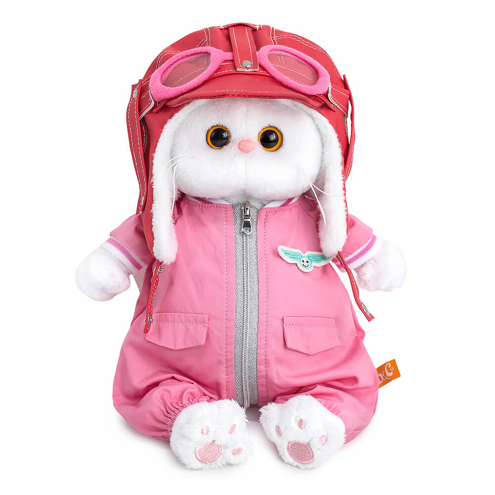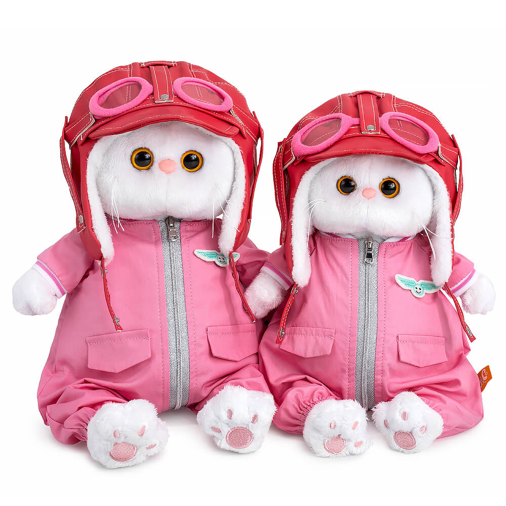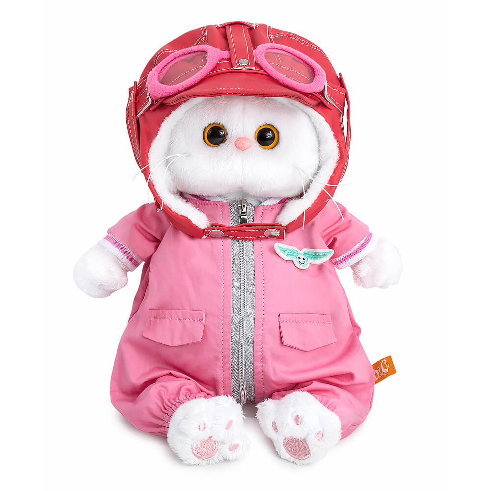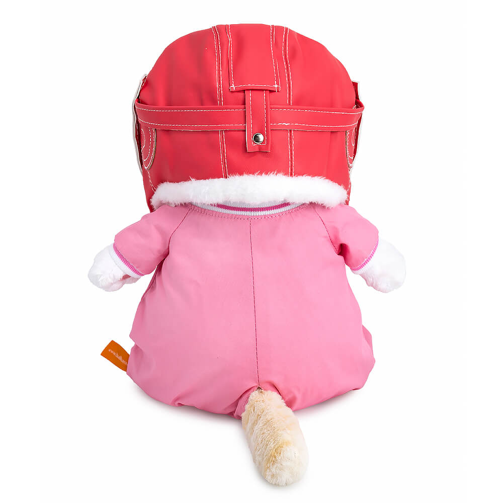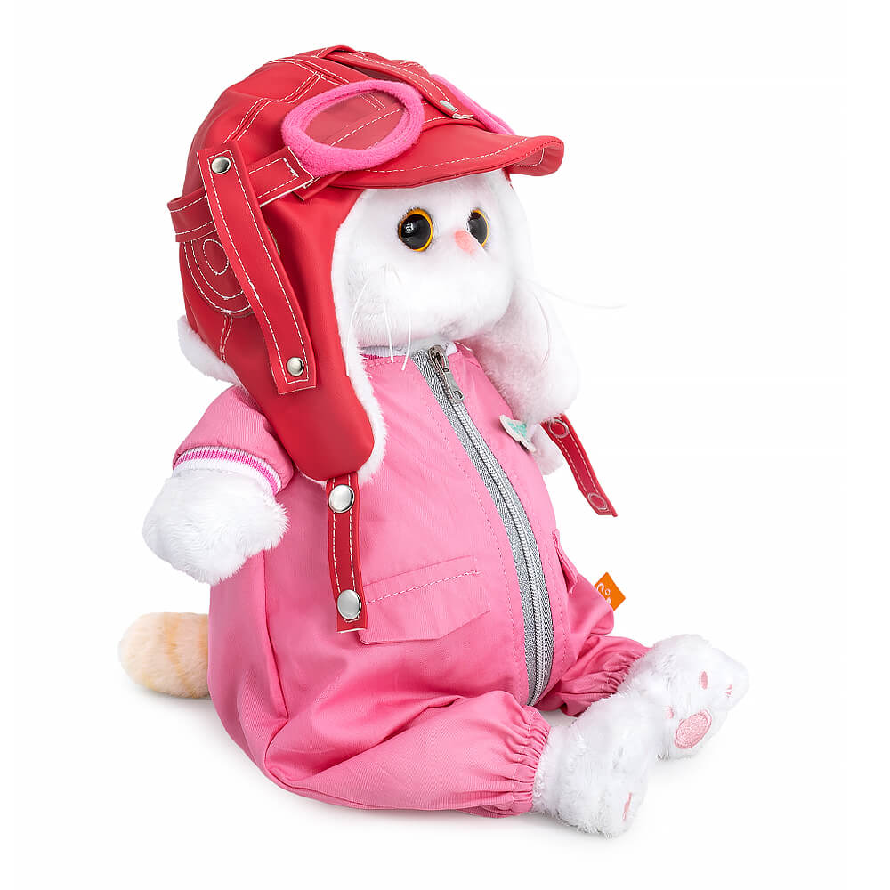Kitty Li-Li in a super stylish flight suit. The kitty is wearing a pink flight jumpsuit, with the neckline and sleeve cuffs trimmed with decorative woven elastic featuring a pink stripe. The jumpsuit is made of thick cotton, with two flaps at the front and a silver zipper closure. The front of the jumpsuit is adorned with a wing-shaped patch. Li-Li is also wearing a cool flight helmet, made of bright pink eco-leather with a white fur lining. The helmet features contrast stitching and straps with silver rivets. Attached to the helmet are special flight goggles lined with bright pink eco-suede.