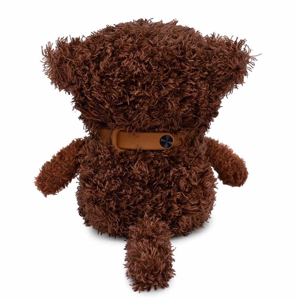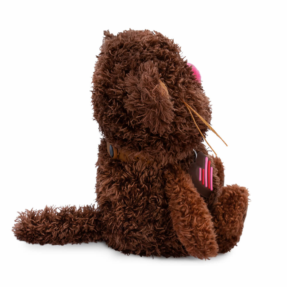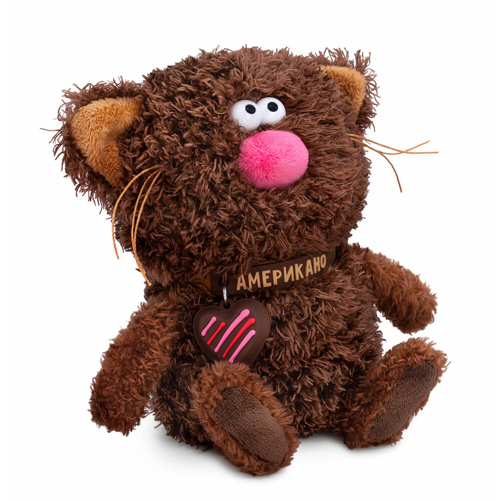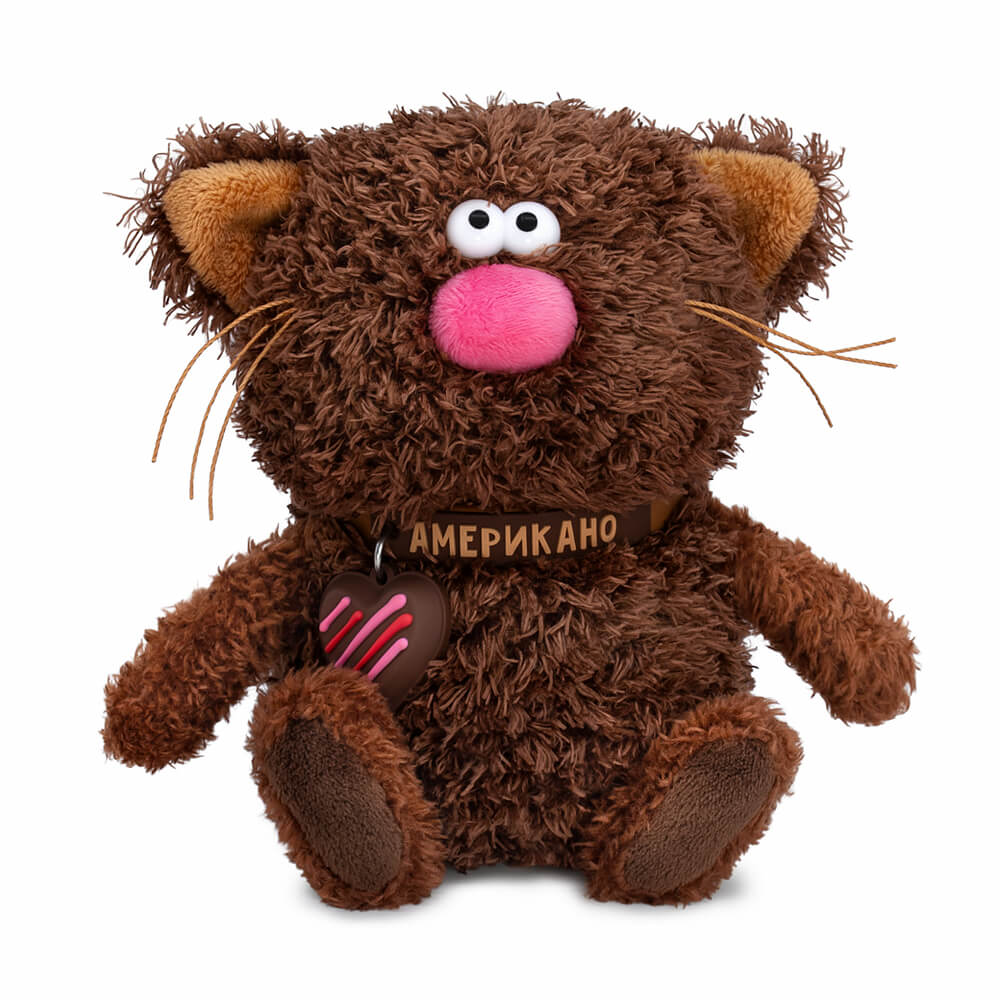 Charming Americano kitty made of tactilely pleasant eco-fur in the color of strong coffee, in a miniature size of 12 cm. Paws and tail are made of shorter fur. Whiskers are made of silky twisted cord. The voluminous nose is covered with pink soft fabric. Eyes are made of plastic. Paw pads are made of chocolate-colored soft fabric, and the inside of the ears is soft fabric in burnt sugar color. The kitty wears a silicone choker on its neck with its name and a small pendant in the shape of a chocolate heart.