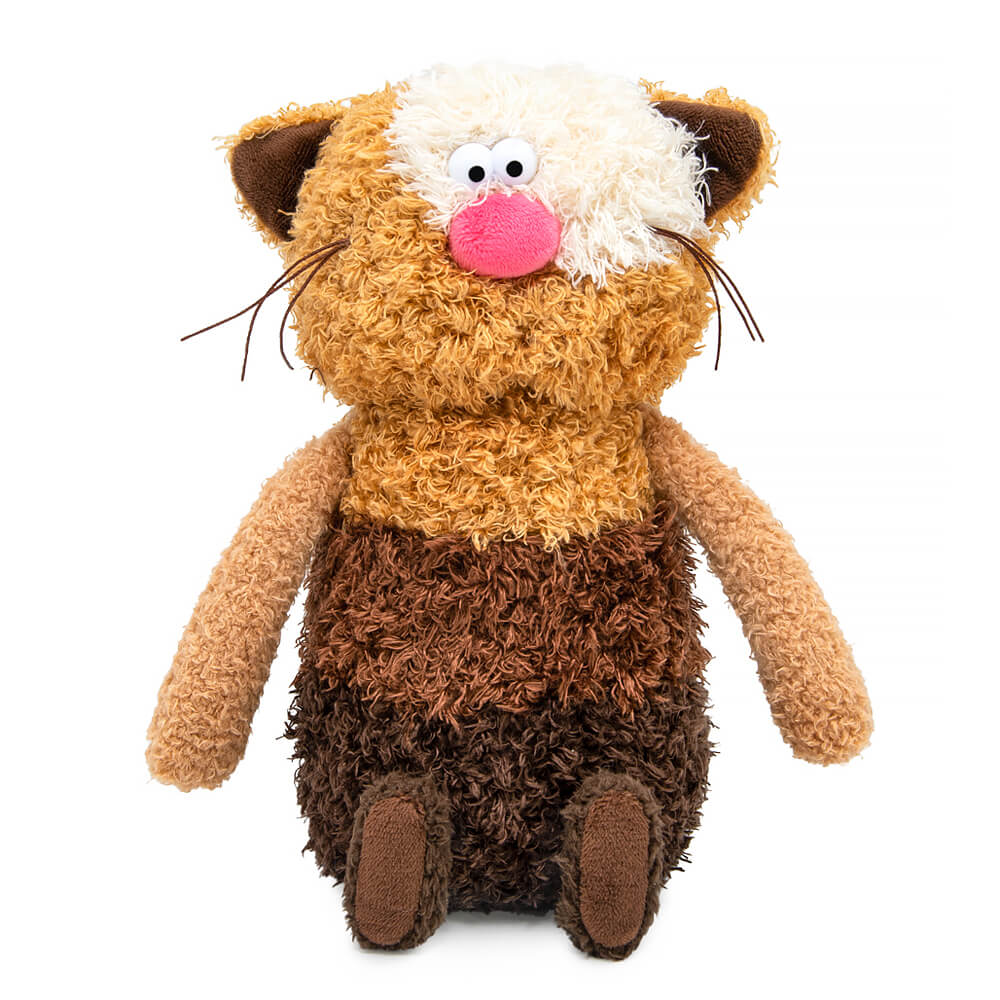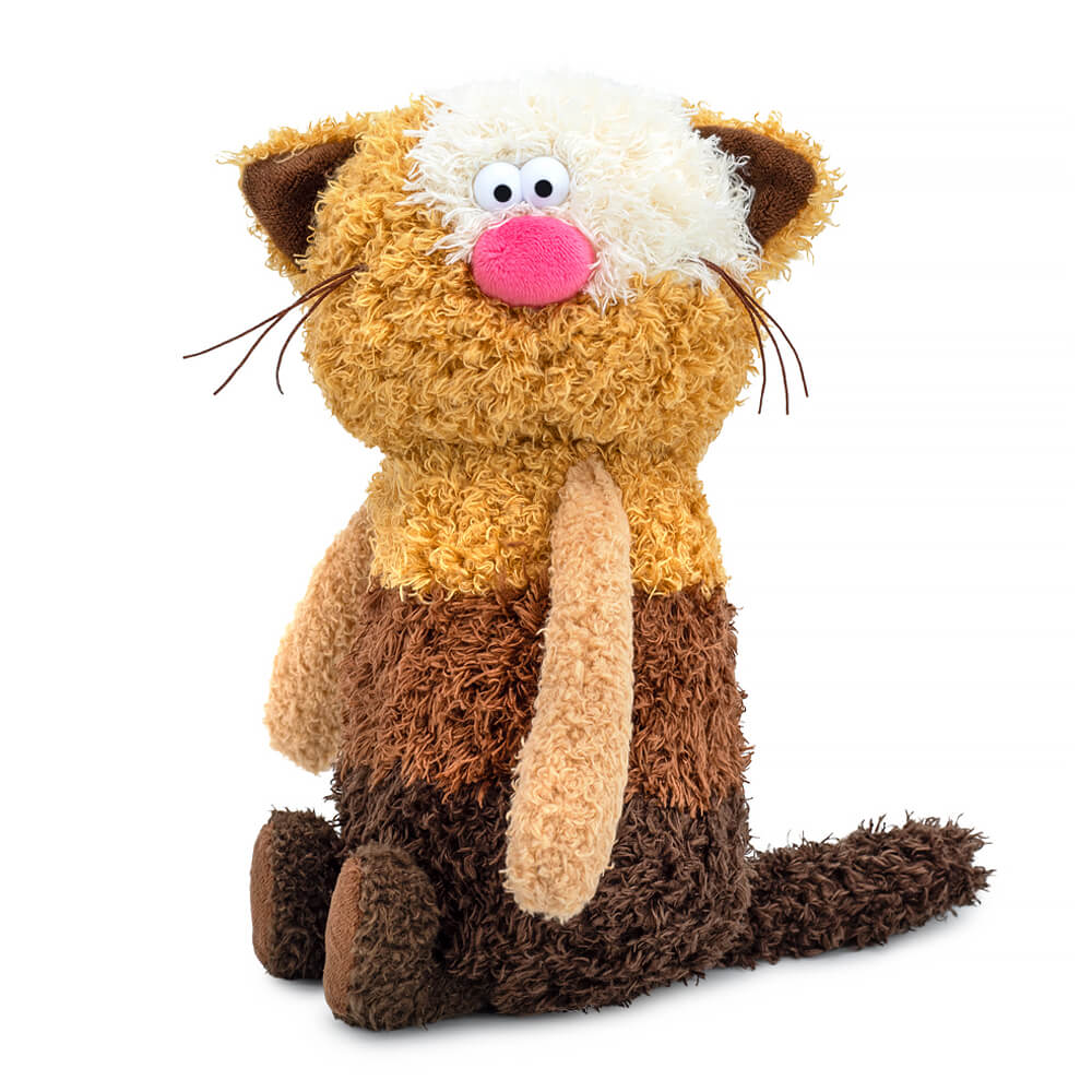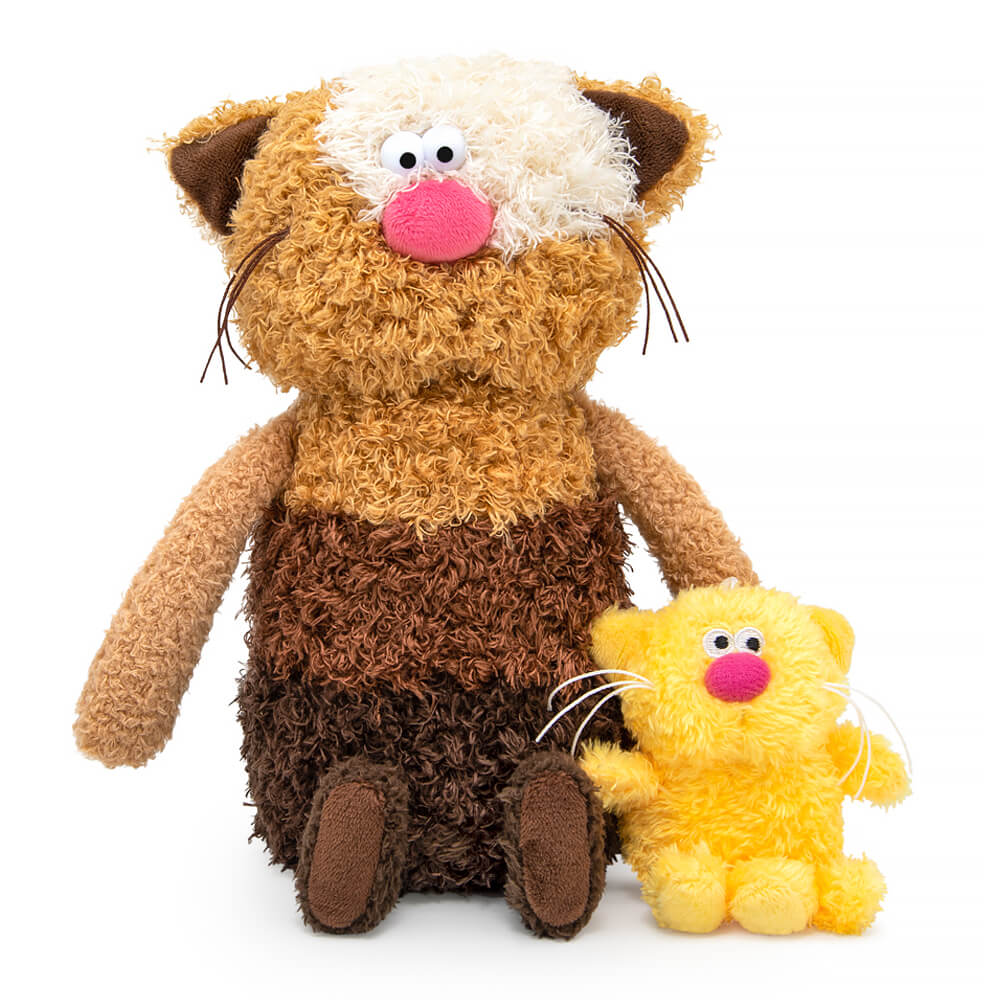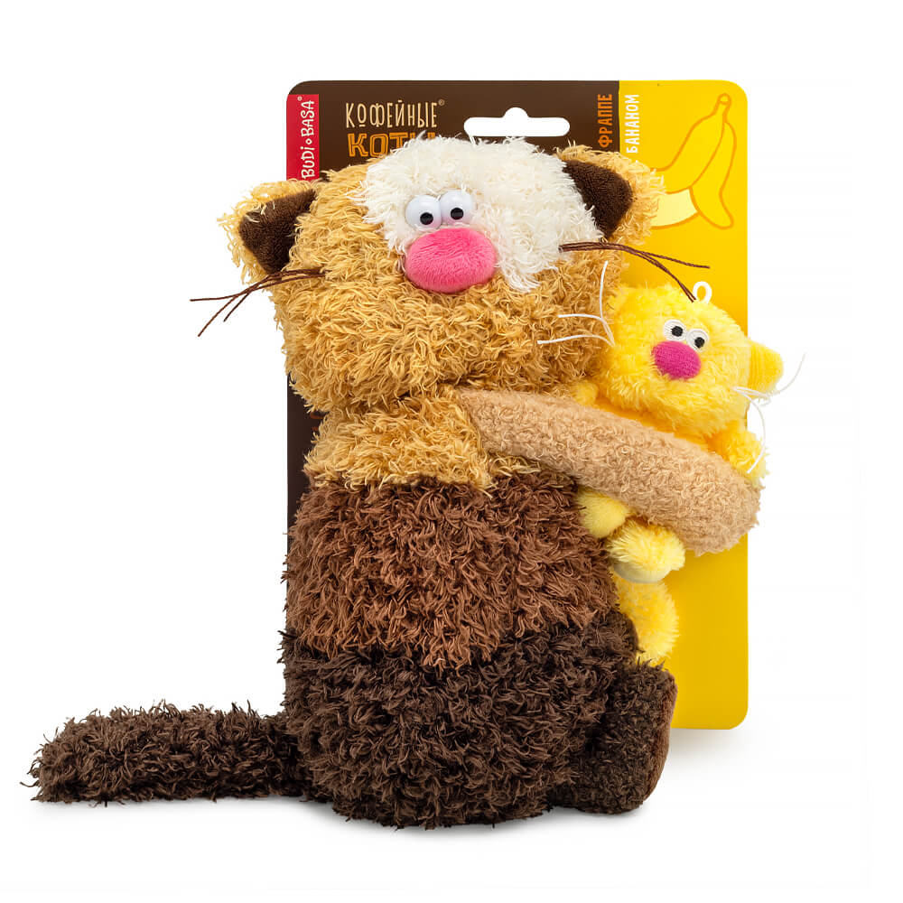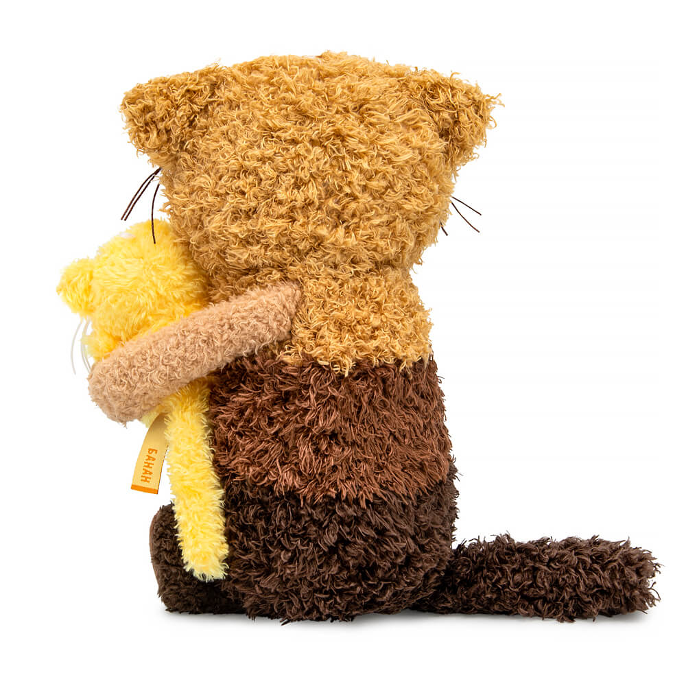 A gorgeous coffee Frappe cat made of tactilely pleasant eco-fur in three shades: the color of bitter chocolate, the color of golden caramel and the snow-white color of milk foam. The cat has a syrupy friend, a Banana kitten. It tastes better this way! Frappe the cat touchingly holds a baby Banana sewn from eco-friendly fur in the color of a ripe banana in his paws. Only in the Syrups collection does the coffee cat's head rotate 360°, thanks to a special rotary mechanism. The kitten syrup has a loop on its head and can be used as a keychain. Each coffee pair has its own individual base.