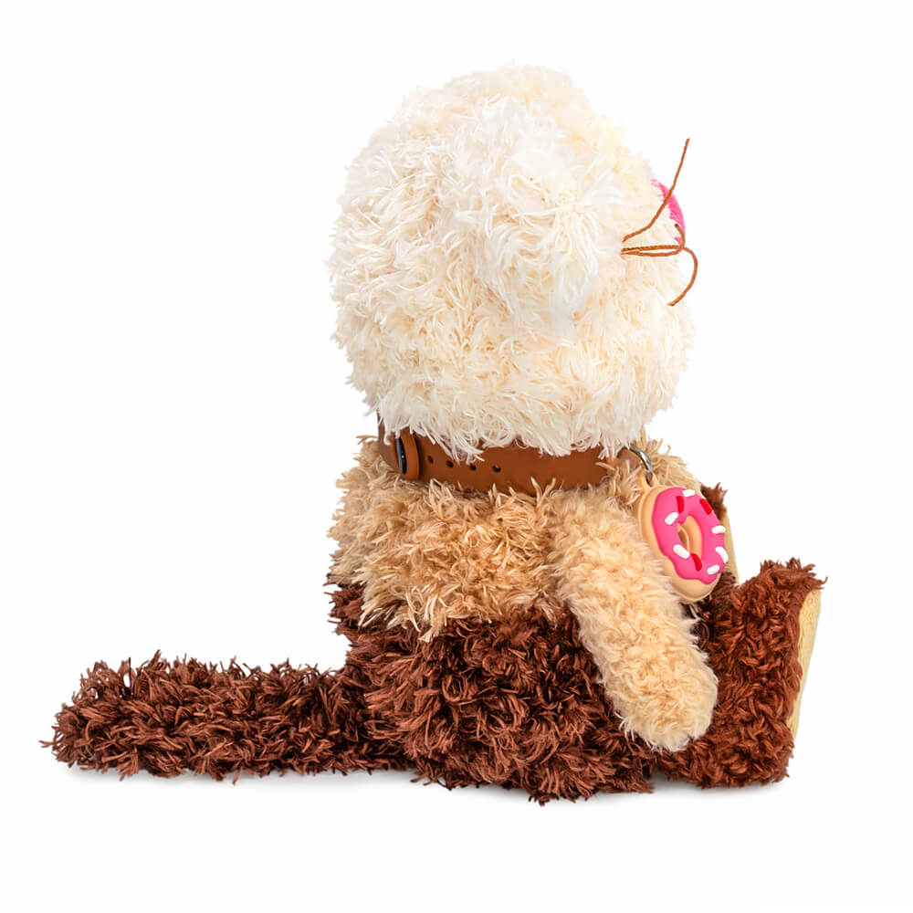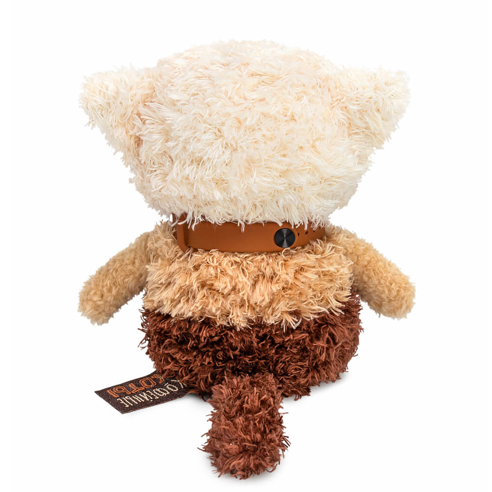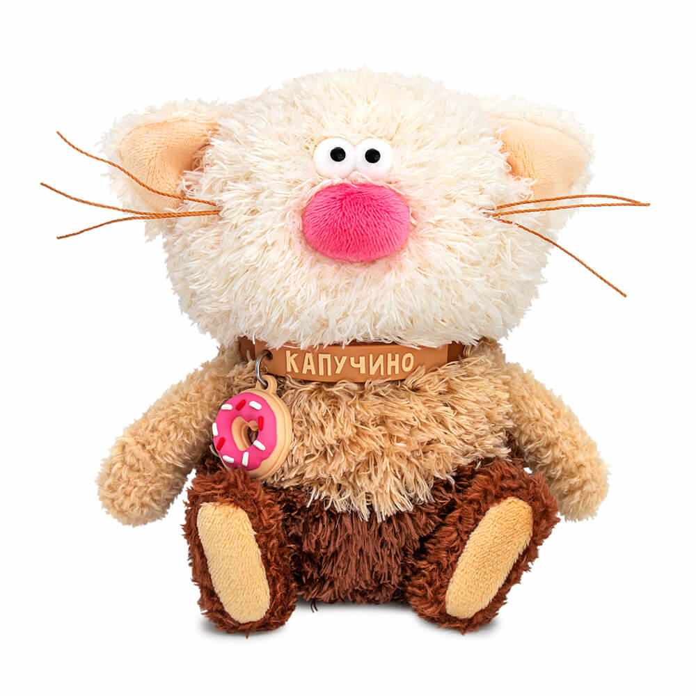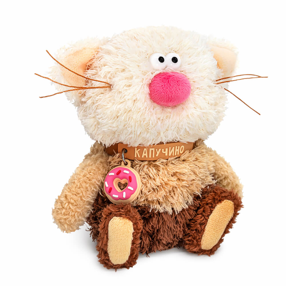 A luxurious Cappuccino cat made of tactilely pleasant eco-fur in three shades: chocolate, cream, and milky color, in a miniature size of 12 cm. The paws and tail are made of shorter fur. The whiskers are made of silky twisted cord. The voluminous nose is covered with pink soft material. The eyes are made of plastic. The paw pads are made of cream-colored soft material, and the inside of the ears is soft in a creamy color. The cat wears a silicone choker on its neck with a name and a small pendant in the shape of a donut with pink icing.