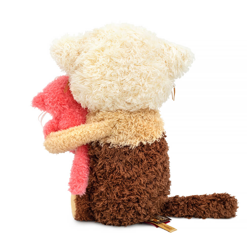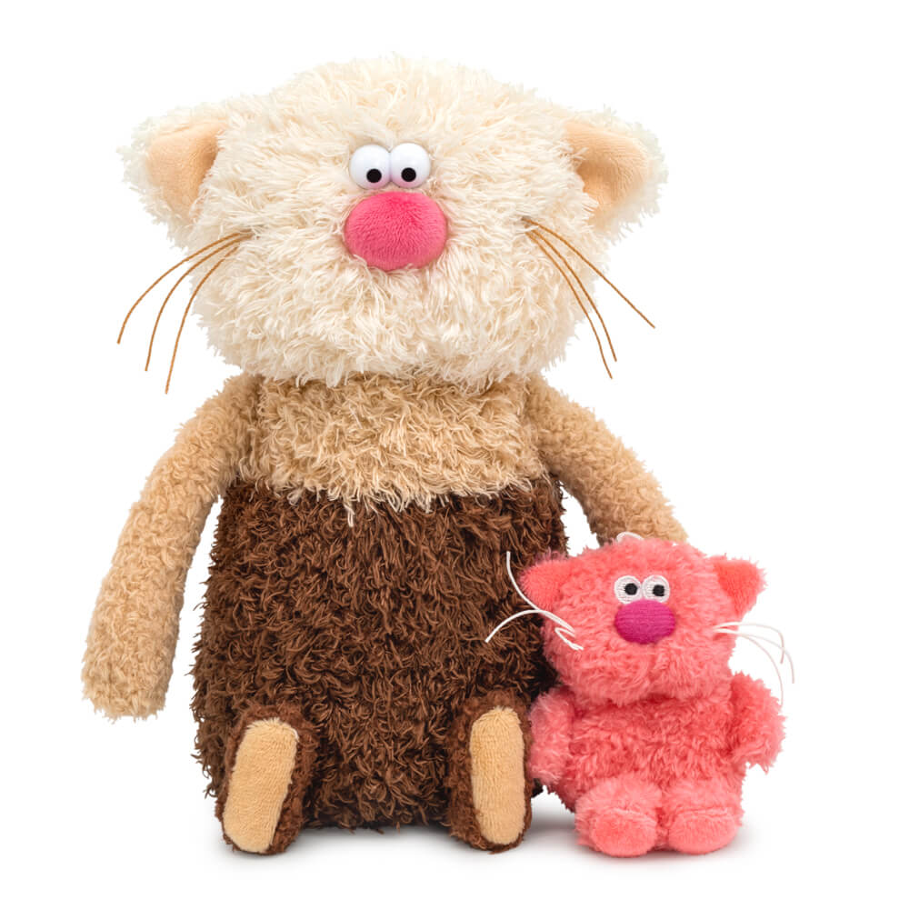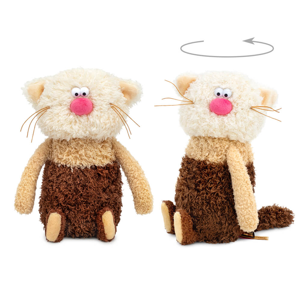 The chic Cappuccino coffee cat is made of tactilely pleasant eco fur in three shades: chocolate, cream, and milk. The cat has a friend, the Strawberry syrup kitten. It's just more delicious! The Cappuccino cat holds the Strawberry kitten, which is made of eco fur in the color of delicate strawberries, in its paws. Only in the "Syrup Cats" collection, the coffee cat's head rotates 360° thanks to a special rotating mechanism. The kitten syrup has a loop on its head and can be used as a keychain. Each coffee pair has its own individual base.