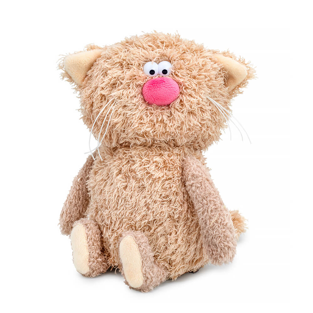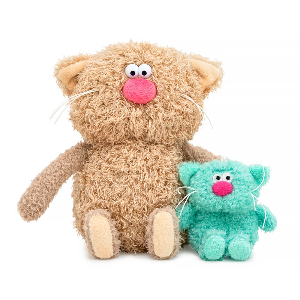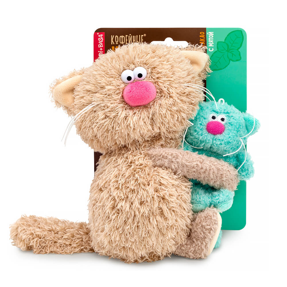 The adorable coffee cat Cocoa is made of tactilely pleasant eco fur in the color of cocoa with milk. The cat has a friend, the syrup kitten Mint. It's just more delicious! The coffee cat Cocoa holds the baby kitten Mint, made of mint eco fur, in its paws. Only in the "Syrup Kittens" collection, the coffee cat's head rotates 360° thanks to a special rotating mechanism. The syrup kitten has a loop on its head and can be used as a keychain. Each coffee pair has its own individual base.