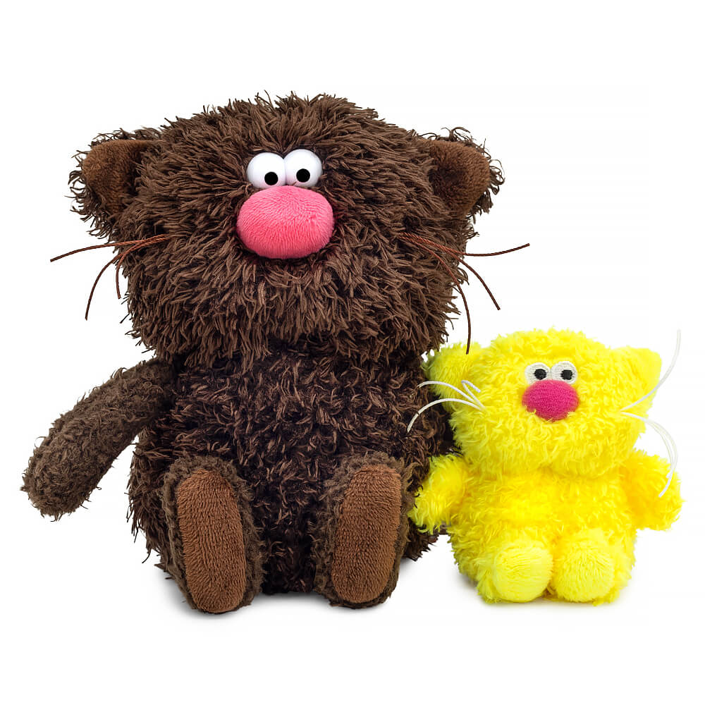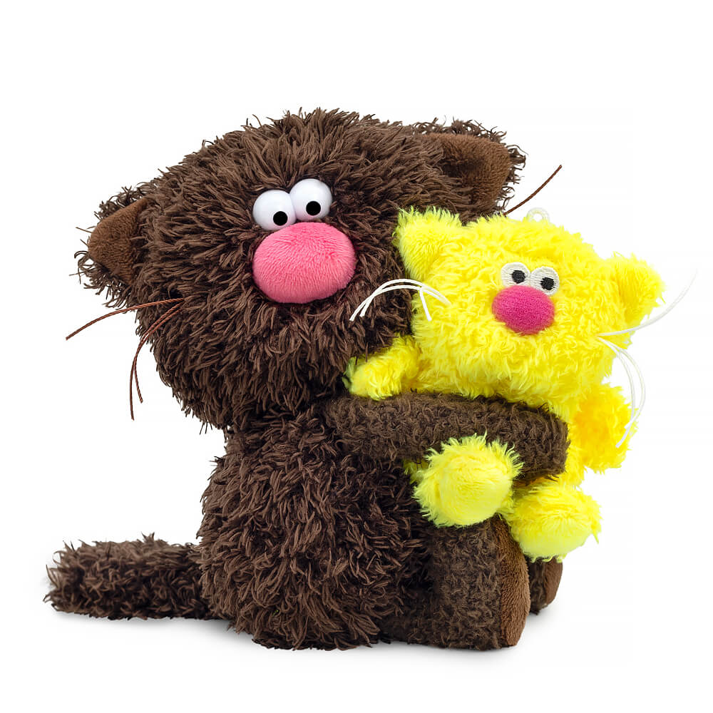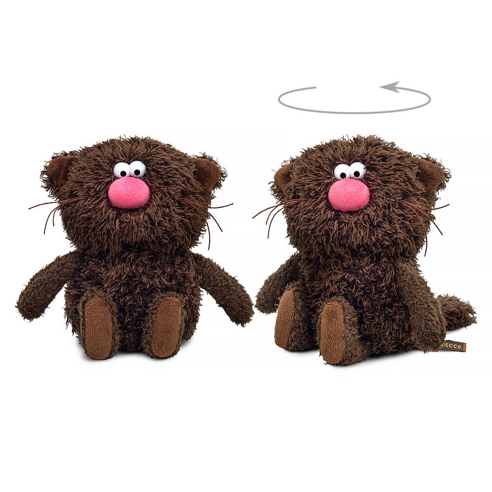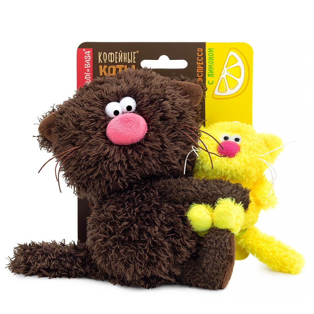 A cute Espresso coffee cat made of tactilely pleasant eco fur in the color of bitter chocolate. The cat has a friend, a Lemon kitten made of bright lemon eco fur. It's just more delicious! Espresso coffee cat holds a baby Lemon kitten in its paws, made of bright lemon eco fur. Only in the "Syropchiki" collection, the coffee cat's head rotates 360° thanks to a special rotating mechanism. The kitten has a loop on its head and can be used as a keychain. Each coffee pair has its own individual base.