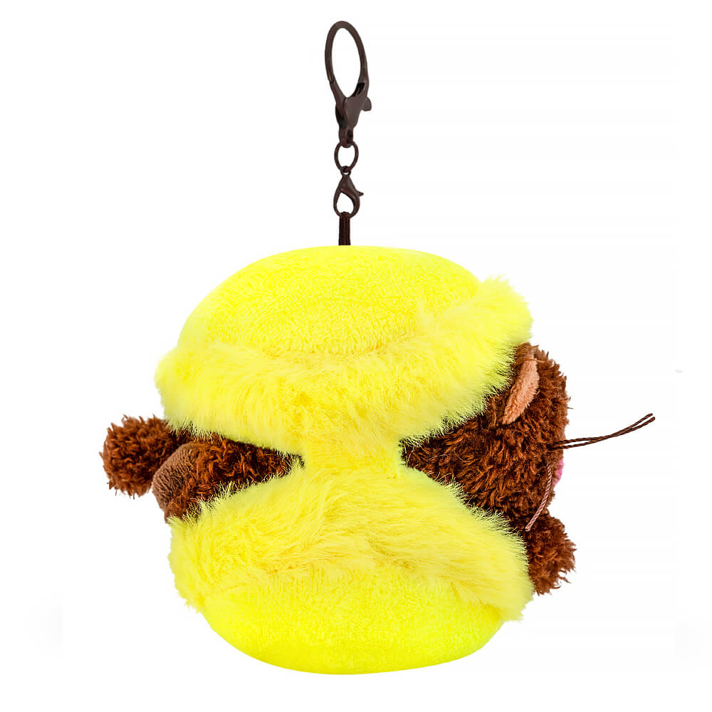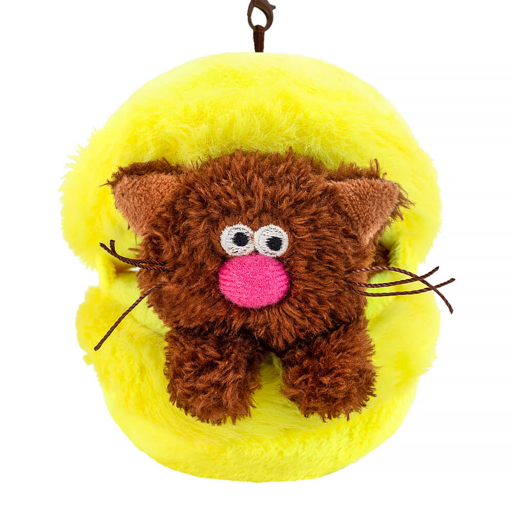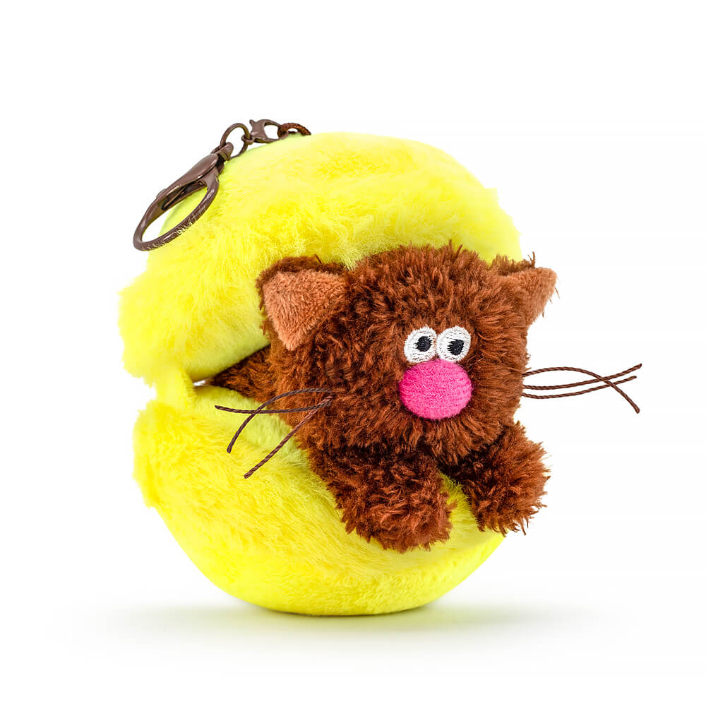 A funny keychain in the form of a cute American kitten made of tactilely pleasant eco fur in the color of strong coffee. The kitten lies between the halves of a macaron cake. The lemon cake is made of bright yellow soft and short fur. The keychain has a convenient chocolate-colored carabiner with clasps that can be detached. The coffee cat and the dessert have a loop, and each can be used as a keychain separately.