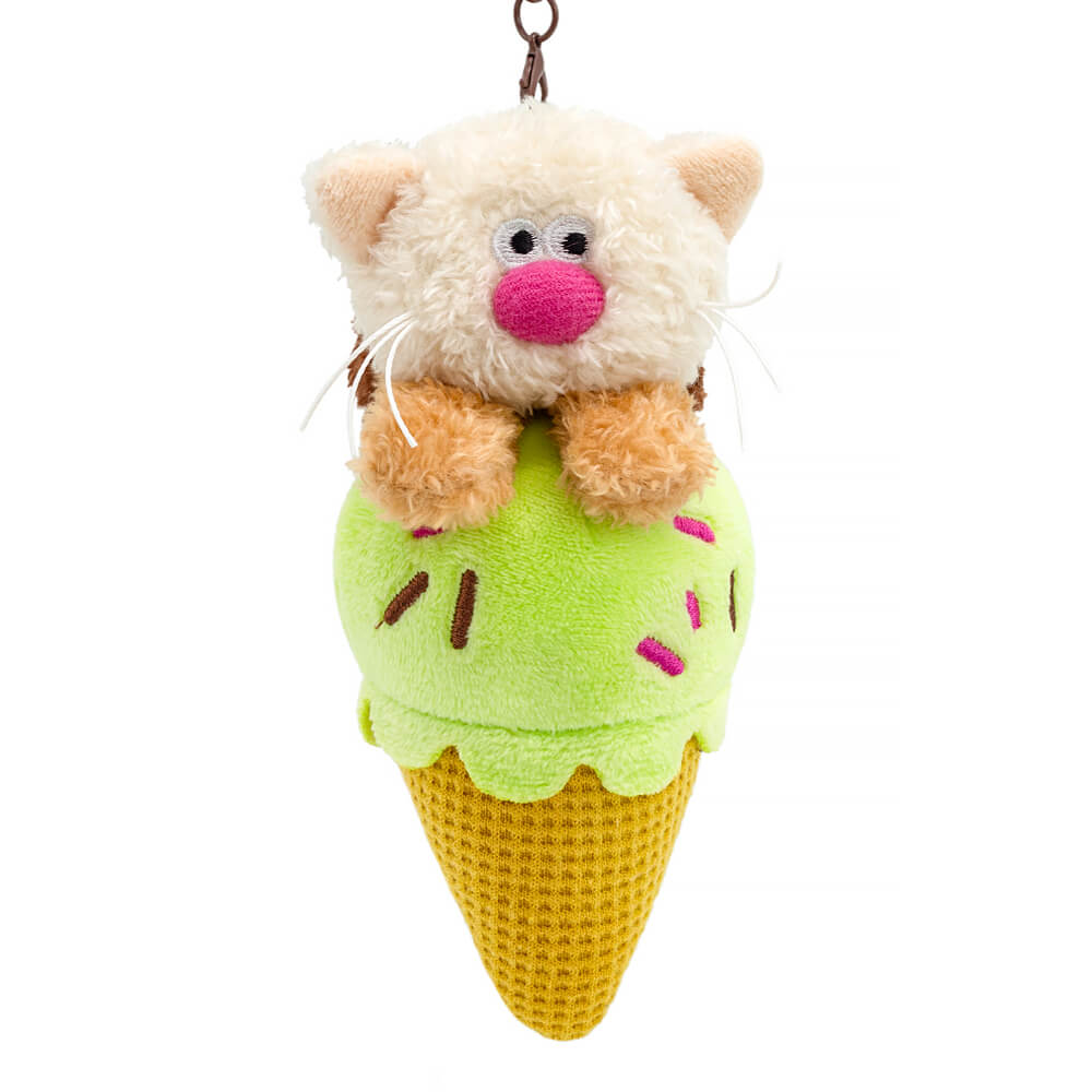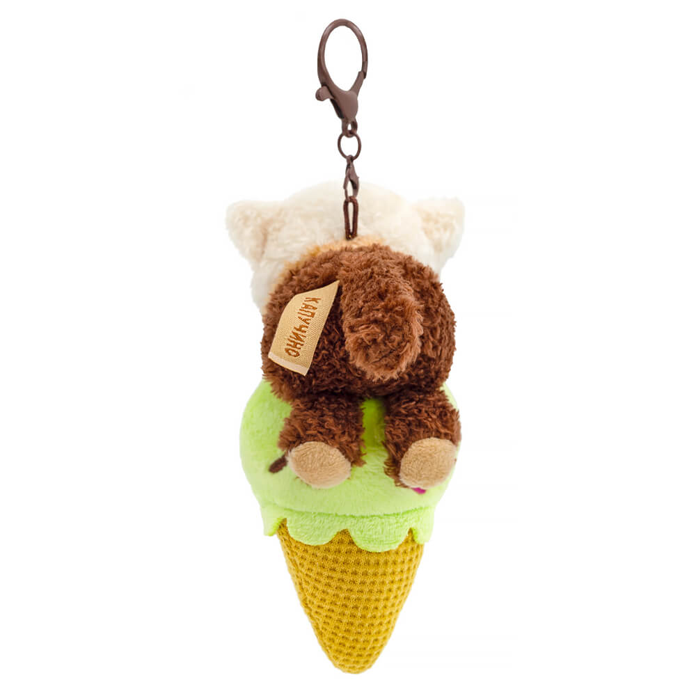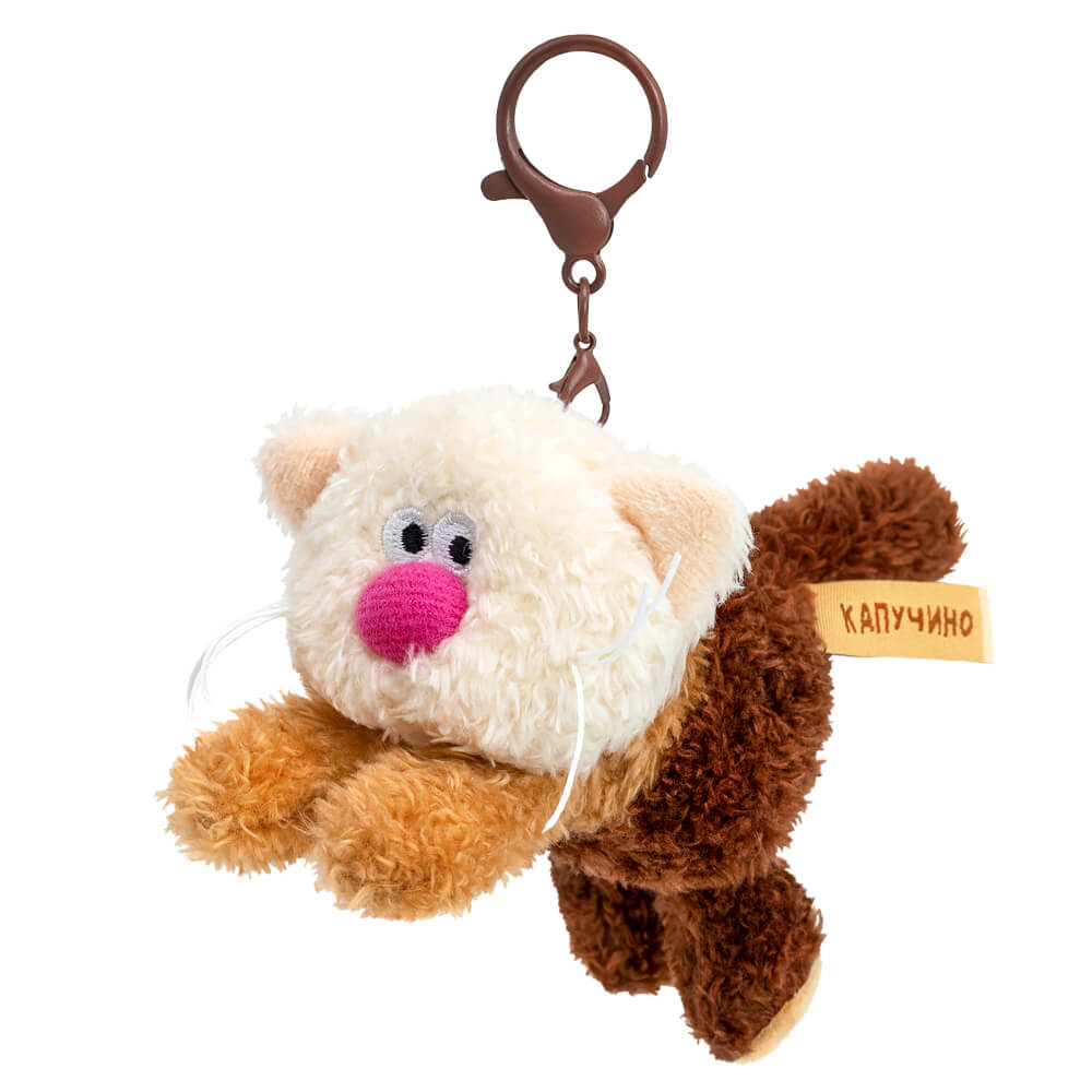 A fun keychain in the form of a cute Cappuccino kitten made of tactilely pleasant eco fur in three shades: chocolate, cream, and milk. The kitten is comfortably nestled on a pistachio ice cream cone. The ice cream cone is made of cookie-colored waffle fabric that imitates a waffle cone, and a pistachio-colored soft with embroidered caramel sprinkles. The keychain has a convenient chocolate-colored carabiner with clasps that can be detached. The coffee cat and the dessert have a loop, and each can be used as a keychain separately.