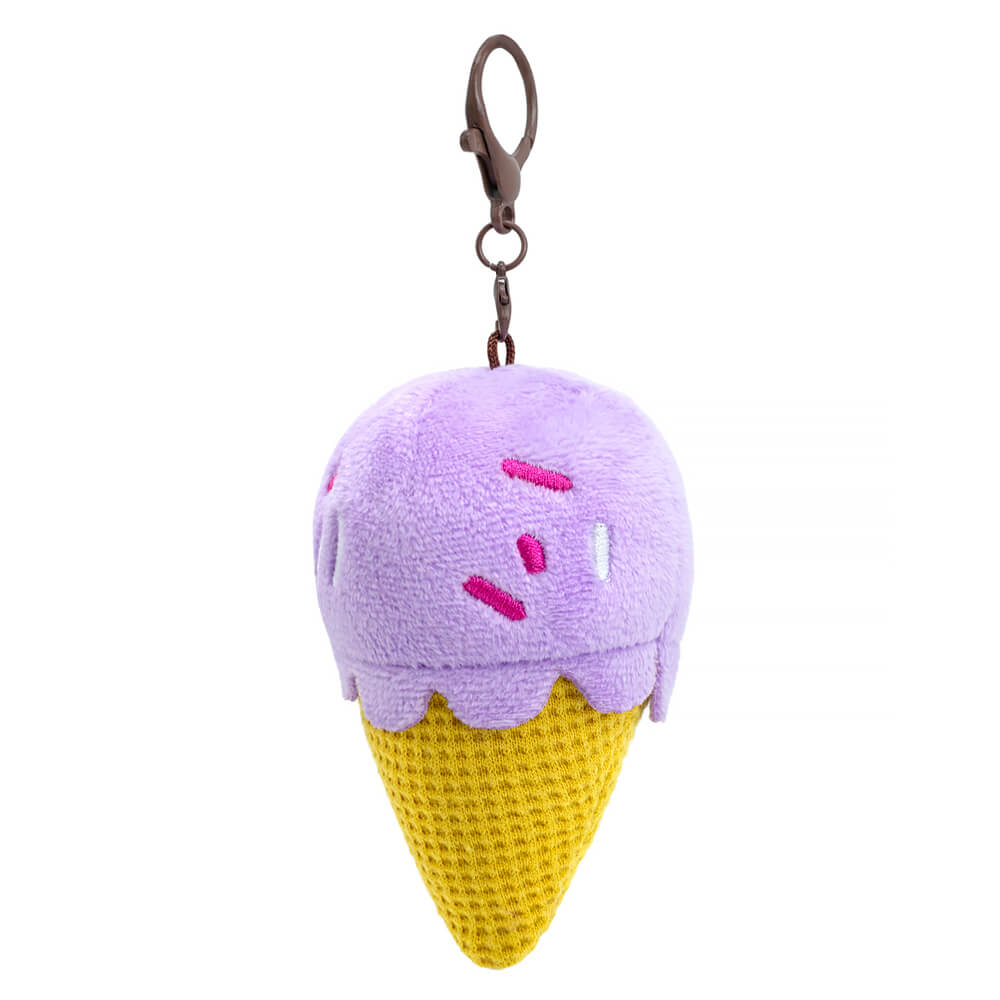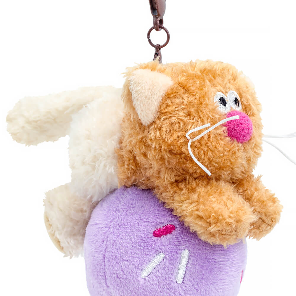 A fun keychain in the form of a cute kitten Raf made of tactilely pleasant eco fur in two shades: the color of a shortbread cookie and the color of top-cream. The kitten is comfortably nestled on a cone of lavender ice cream. The ice cream is made of cookie-colored waffle fabric that imitates a waffle cone, and lilac soft with embroidered caramel sprinkles. The keychain has a convenient chocolate-colored carabiner with clasps that can be detached. The coffee cat and the dessert have a loop, and each can be used as a keychain separately.