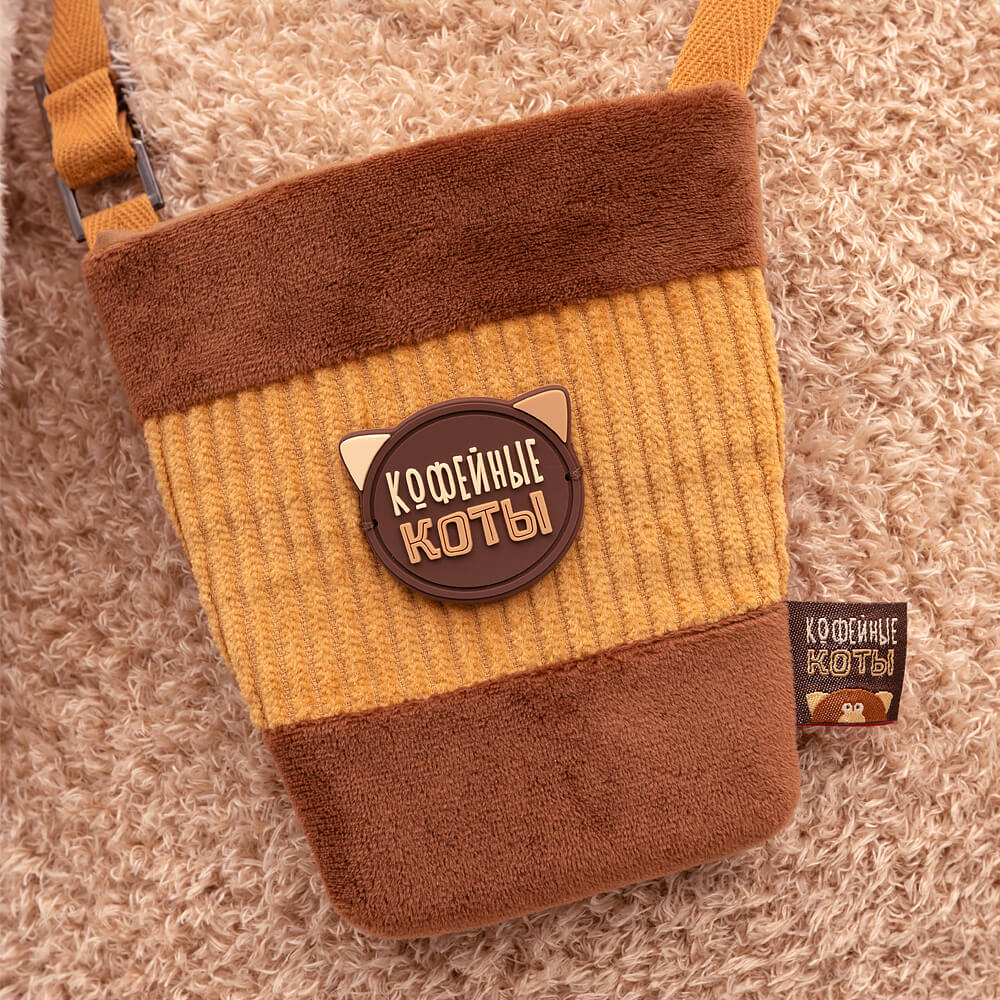 A large coffee-colored cat Latte made of tactilely pleasant eco-fur in three shades: milk cocoa, melted milk, and snow-white milk foam. The paws and tail are made of shorter fur. The whiskers are embroidered with silky threads. The voluminous nose is covered with pink soft fabric. Expressive eyes made of plastic. The paw pads are made of cream-colored soft fabric, and the inside of the ears is soft cream and caramel colors. Under the cat's muzzle, two labels are sewn in with the cat's name and a touching hashtag #themosttendercat. Cat Latte has an interesting accessory - a little bag in the shape of a coffee cup with a long strap. The bag is sewn from coffee-colored soft fabric and craft-colored corduroy. A silicone label is attached to the bag.