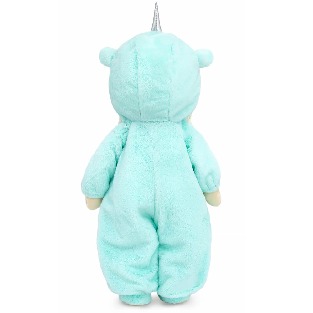 Avrora textile doll with two braids made of ghostly white yarn. Aurora has a cool free Unicorn kigurumi. The kigurumi is made of soft, short, ice-glass-colored fur, with buttons on the front decorated with pink pompoms. A hood with a silver unicorn horn and ears, inside of which soft pink fabric is sewn. The bottom of the sleeves and pants are gathered on elastic bands. Aurora has cute soft boots made of basic fur on her feet, with soles made of thick milky fleece.