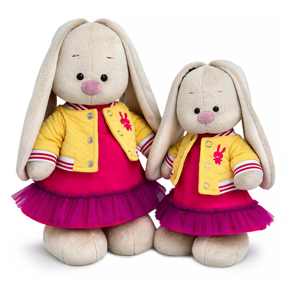 Zaika Mi in a scarlet dress made of thick knitwear. A frill of thin magenta mesh is sewn on the hem of the dress. A very stylish bomber jacket in a fashionable cream color is worn over the dress. The bomber is made of cotton knitwear with diamond-shaped stitching and inserts of knitted elastic in white and red stripes. The front of the bomber jacket is fastened with shirt buttons.