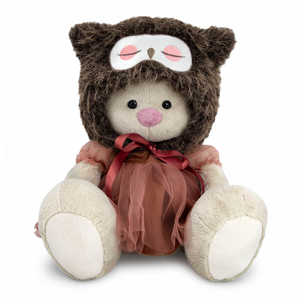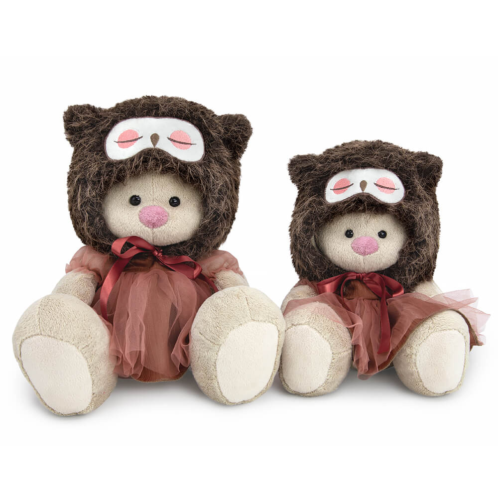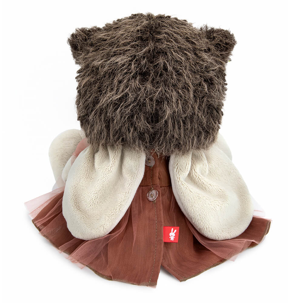 Zaika Mi in an unusual Owl hat. A voluminous hat with ears is sewn from interesting fur, as if with feathers. The hat has an embroidery applique in the form of a sleeping owl's face. The hat is tied in front with chocolate-colored satin ribbons. Zaika is also wearing a gorgeous dress made from two companion fabrics – pressed coffee-colored mixed fabric and the most delicate mesh to match. A dress with lantern sleeves, cut-off at the waist and with a back closure with transparent buttons.